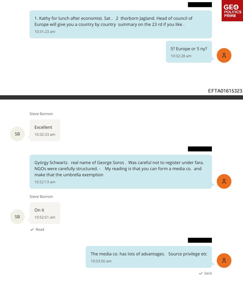 Steve Bannon received detailed information about George Soros, including his birth name, FARA evasion tactics, and NGO structuring.