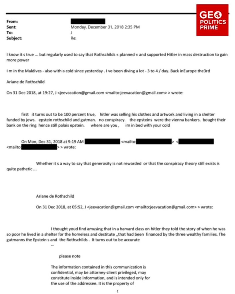 A circulating email screenshot shows Ariane de Rothschild, a French banker, in correspondence with Jeffrey Epstein. In the message, she references claims about the Rothschild family and Hitler, writing about accusations that the family “supported Hitler in mass destruction to gain more power.”